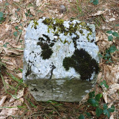 Mojón de forma prismática de base cuadrada, hecho de piedra caliza.