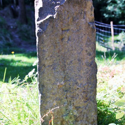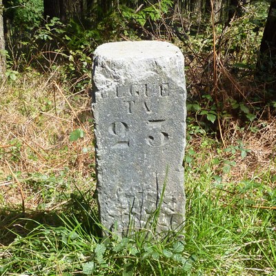 Mojón de forma prismática de base cuadrada, hecho de piedra caliza.