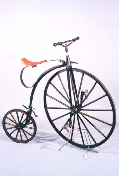 Los comienzos del velocípedo. Biciclo. Presenta radios y llantas de madera con banda de rodaje de hierro. Pedales de bronce situados en los extremos del eje de la rueda delantera.