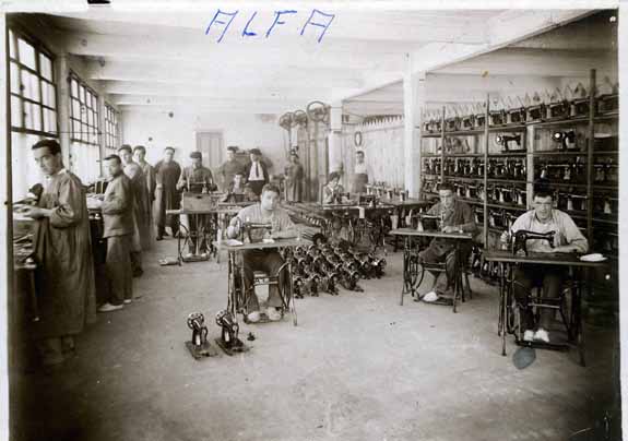 Trabajadores de la empresa Alfa, hacia 1930. Alfa nació el año 1920 con la intención de dedicarse a la fabricación de armas de fuego. Debido a las constantes crisis que sufría el sector, no dudaron en comenzar la fabricación de máquinas de coser. Durante los años 50 y 60 se convirtió en la mayor empresa de Eibar. Junto a otras manufacturas, hoy en día sigue fabricando máquinas de coser. Código de la colección: Aitor014.