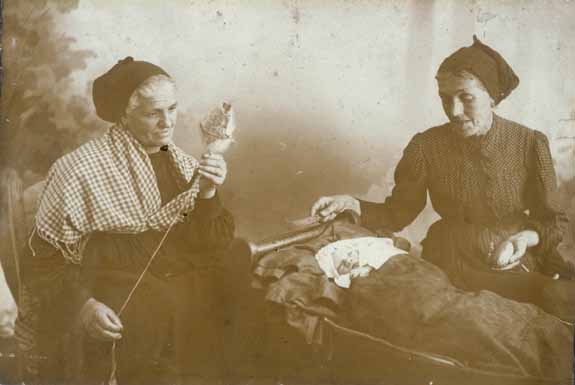 Dos amas de casa juntas en la cocina de la casa: una pela patatas mientras la otra teje la lana. Hacia 1905. Código de la colección: Aran004.