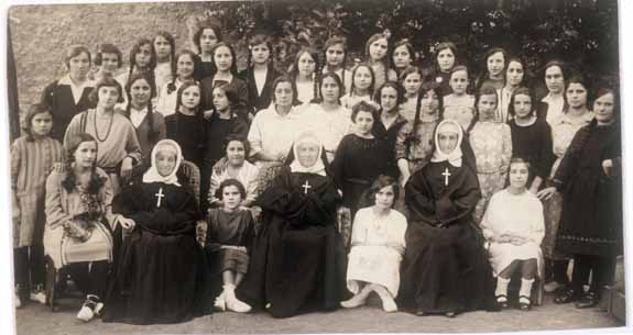 Alumnas del colegio Aldatze, junto a varias profesoras, a la entrada del colegio. Código de la colección: Murg004.