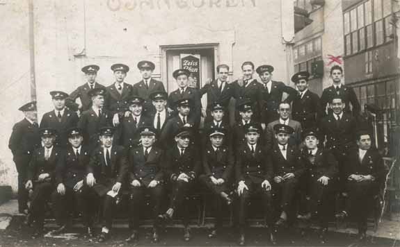 La banda de música de Eibar, posando a la entrada del estudio del fotógrafo Ojanguren, en la calle Dos de Mayo (actual Toribio Etxebarria). Código de la colección: Smar006.