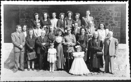 Santuario de Arrate. Enlace de Isabel de la Torre y Manuel Crovetto. Fila superior de izda. a dcha.: Laura Arizmendiarreta, Rosita Arizmendiarreta, José Suárez, Agueda de la Torre, Mª Rosa de la Torre, Carmen de la Torre y Eduardo Aguiriano. Fila central, de izda. a dcha.: Elena Olano, Constantino Suárez, Juliana de la Torre, Timoteo Aguiriano, Antonio Olano y Juanita Aguiriano. 1ª Fila de izda. a dcha.: Julián Azpiazu, Herminia de la Torre, Don Primo, los contrayentes, Isabel de la Torre y Manuel Crovetto, Elena de la Torre, los padres, Josefa Bilbao y Julián de la Torre. Los niños: Carlos Aguiriano y Elena Hoyos. Año 1947. Autor: Indalecio Ojanguren. (Fondo Herminia de la Torre).