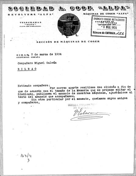 Toribio Etxebarriaren karta, Alfa Kooperatibaren gerente zen garaikoa, 1934ko martxoaren 7koa. Eibarko Udal Artxiboa. Toribio Etxebarria Fondoa