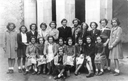 Petra Chueca eta bere ikasleak. Jarrita, ezkerretik eskumara: Mª Luisa Arzuaga, Mª Tere Bereziartua, Mª Pilar Sologaistua, Juanita Santamaría, Consuelo Amutxastegi, Alicia Sarasqueta, Merche Maiztegi, Edurne Laspiur eta Mª Tere García. Zutik, ezkerretik eskumara: Carmen Lapeyra, Julita Martínez, Herminia Errasti, Mª Esther Urkidi, Lorea Lasa, Doña Petra, Mª Elena Etxekopar, Amaia Bergaretxe, Mª Paz “Pacita” Etxeberria, Mª Luisa Gutiérrez eta Mª Tere Ortuoste. 1943. urtea. Argazkilaria: Indalecio Ojanguren. (Petra Chueca eta Mª Tere Garcíaren argazki-bilduma).