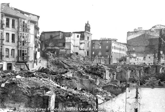 Muzategi eta Errebal ingurua horrela geratu zen 1937ko bonbardaketen ostean. Indalecio Ojanguren argazki bilduma. Eibarko Udal Artxiboa.